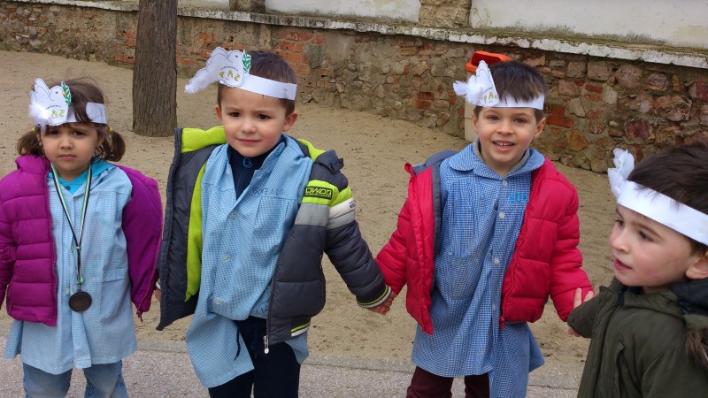 Este año, al igual que en años anteriores, hemos salido al patio escolar para cantar una canción relacionada con la paz (esta vez ha sido Paz, paz, paz de Juanes). Lo cierto es que hacía un día muy desapacible y casi se nos vuelan las palomas que nos hemos hecho para el pelo, pero para los niños ha sido divertido y novedoso ver como todo el centro hacía una actividad comunitaria.