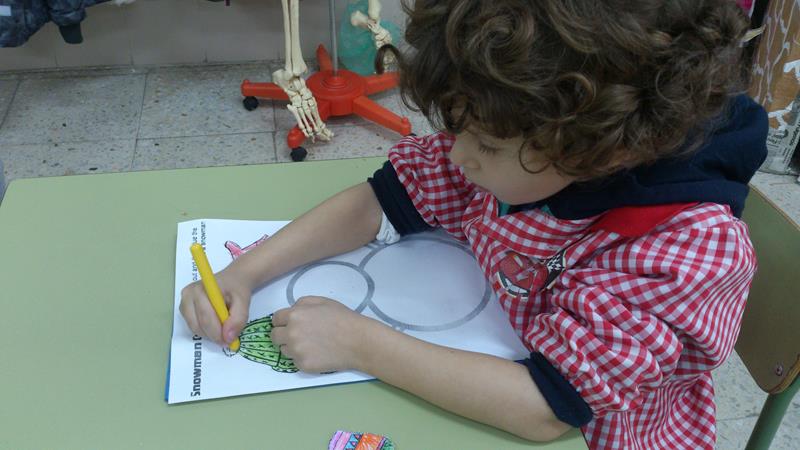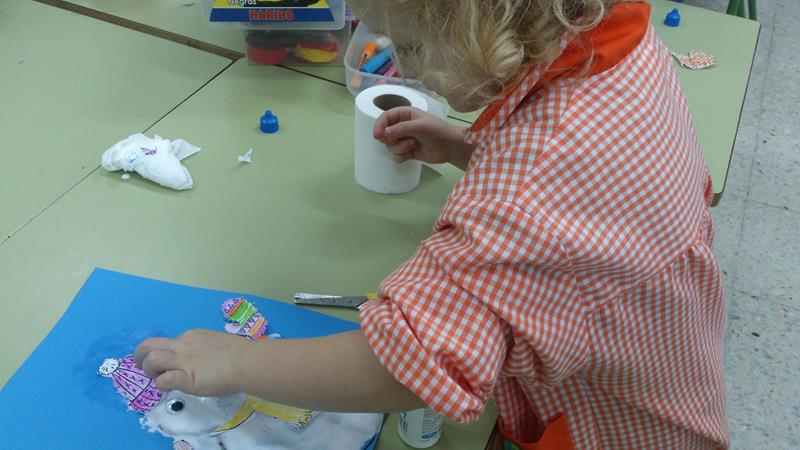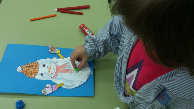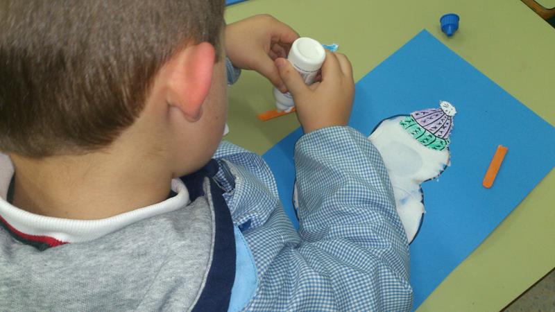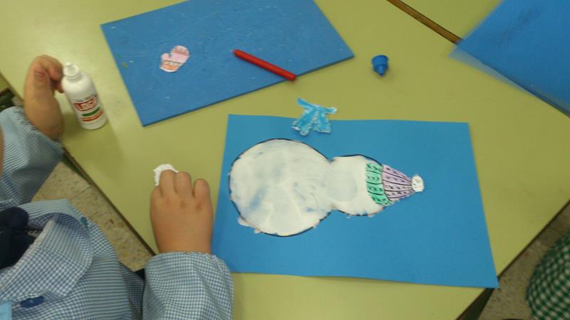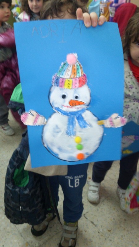 Pocos días después realizamos un muñeco de nieve con esta misma técnica, pero añadiendo cola blanca bastante espesa a la espuma; ya lo había probado en casa con mi hija pequeña y los resultados fueron buenos. Cuanto más cola, mejor. Por supuesto hay que dejar secar en horizontal.