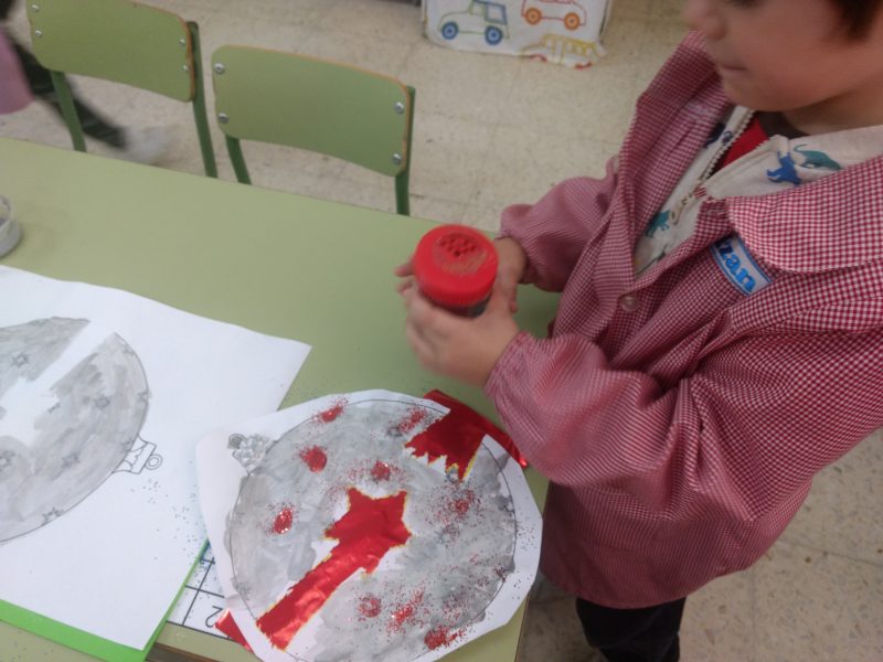 Hemos preparado nuestra carpeta del trimestre con una bola navideña decorada con papel metalizado y brillantina. Y le hemos pegado el nombre con letras de goma Eva.