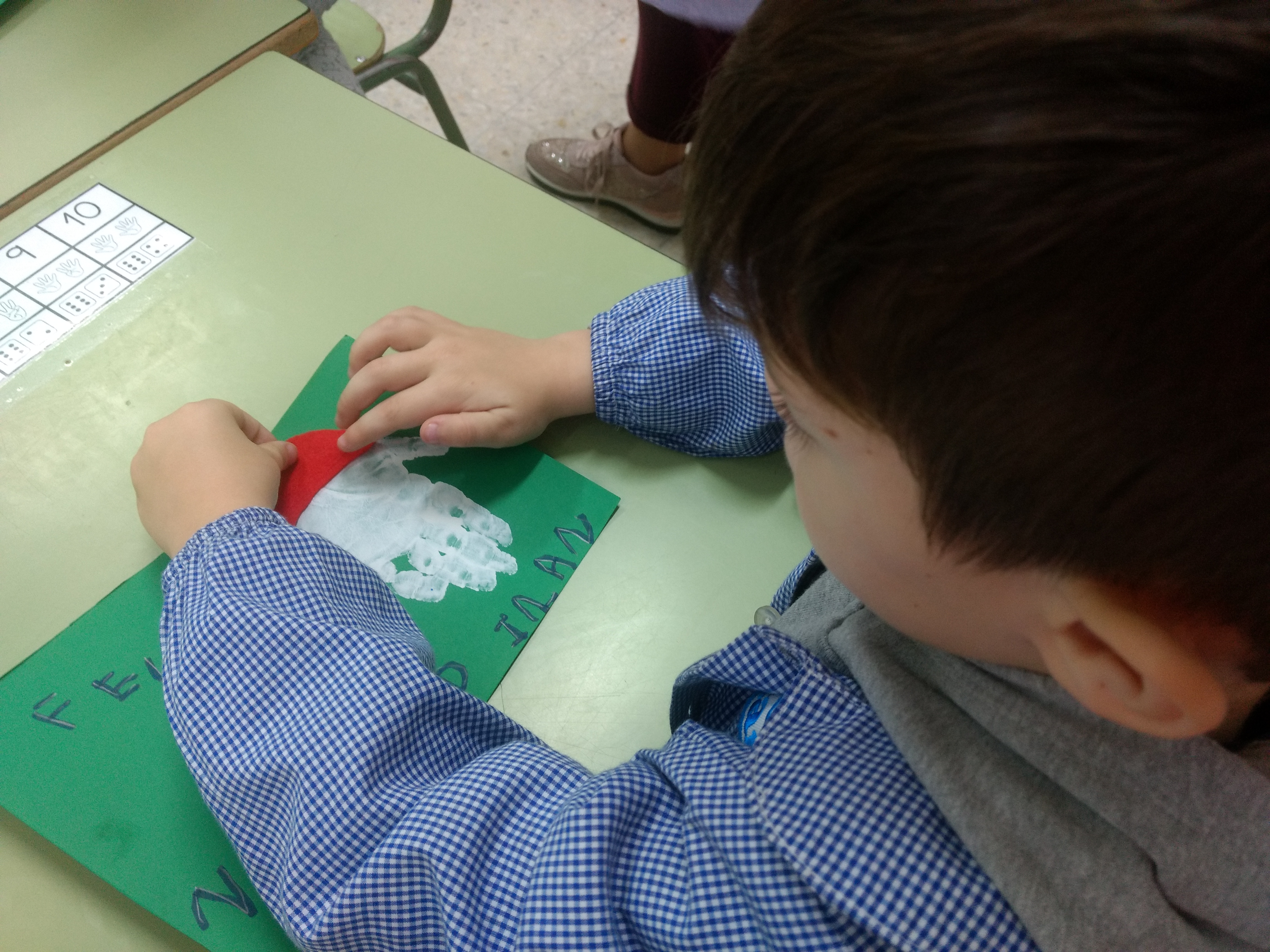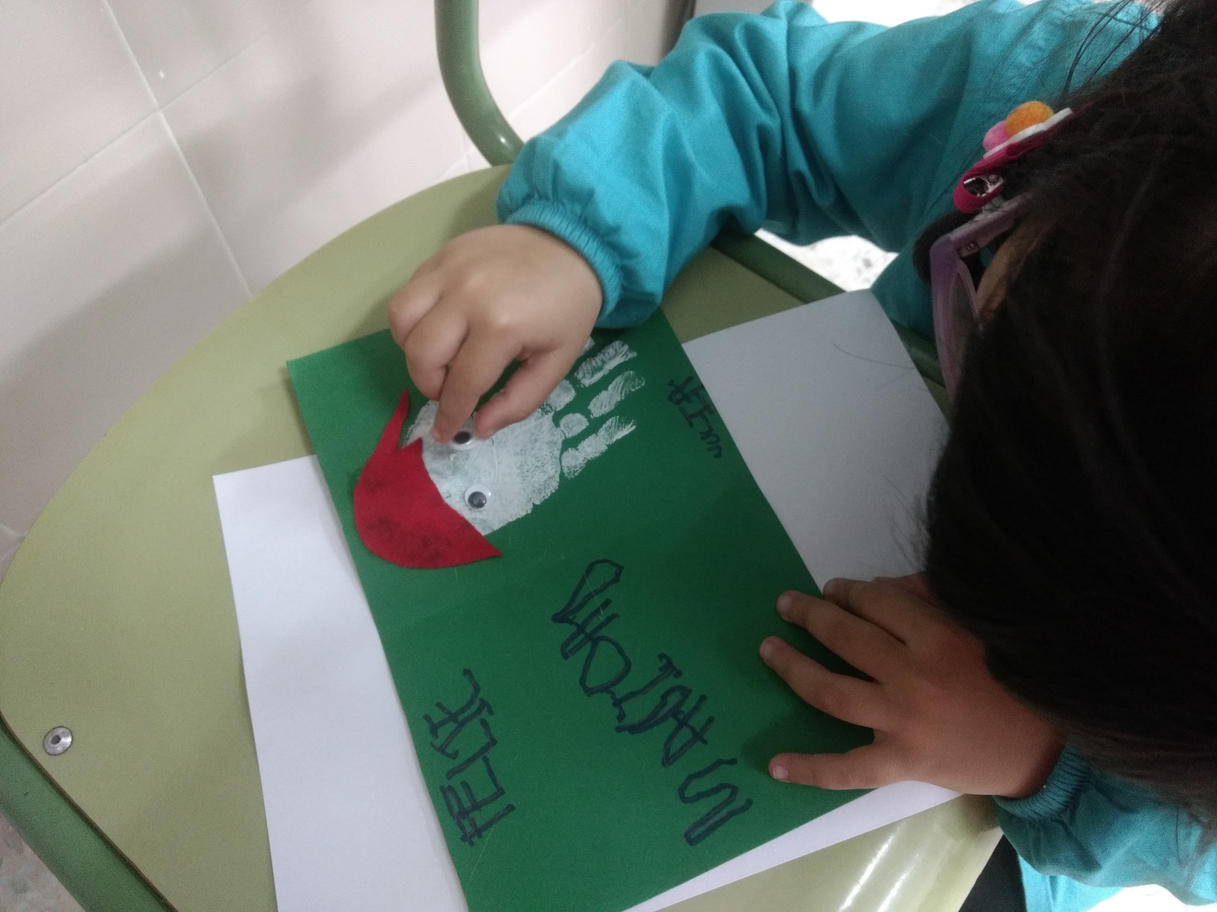 Han realizado una tarjeta navideña de Papá Nöel con su mano y un árbol navideño: