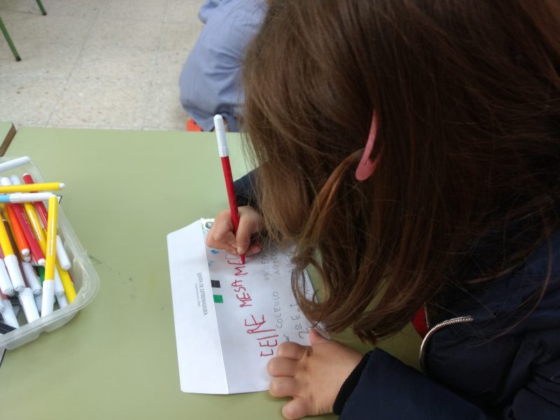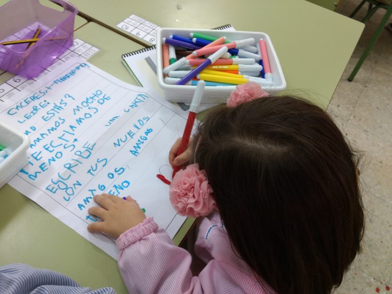 Leire nos mandó hace algún tiempo un vídeo a través de un correo electrónico. Nosotros le hemos contestado con una carta que hemos hecho entre todos y todas. Para ser la primera ha quedado bastante bien.