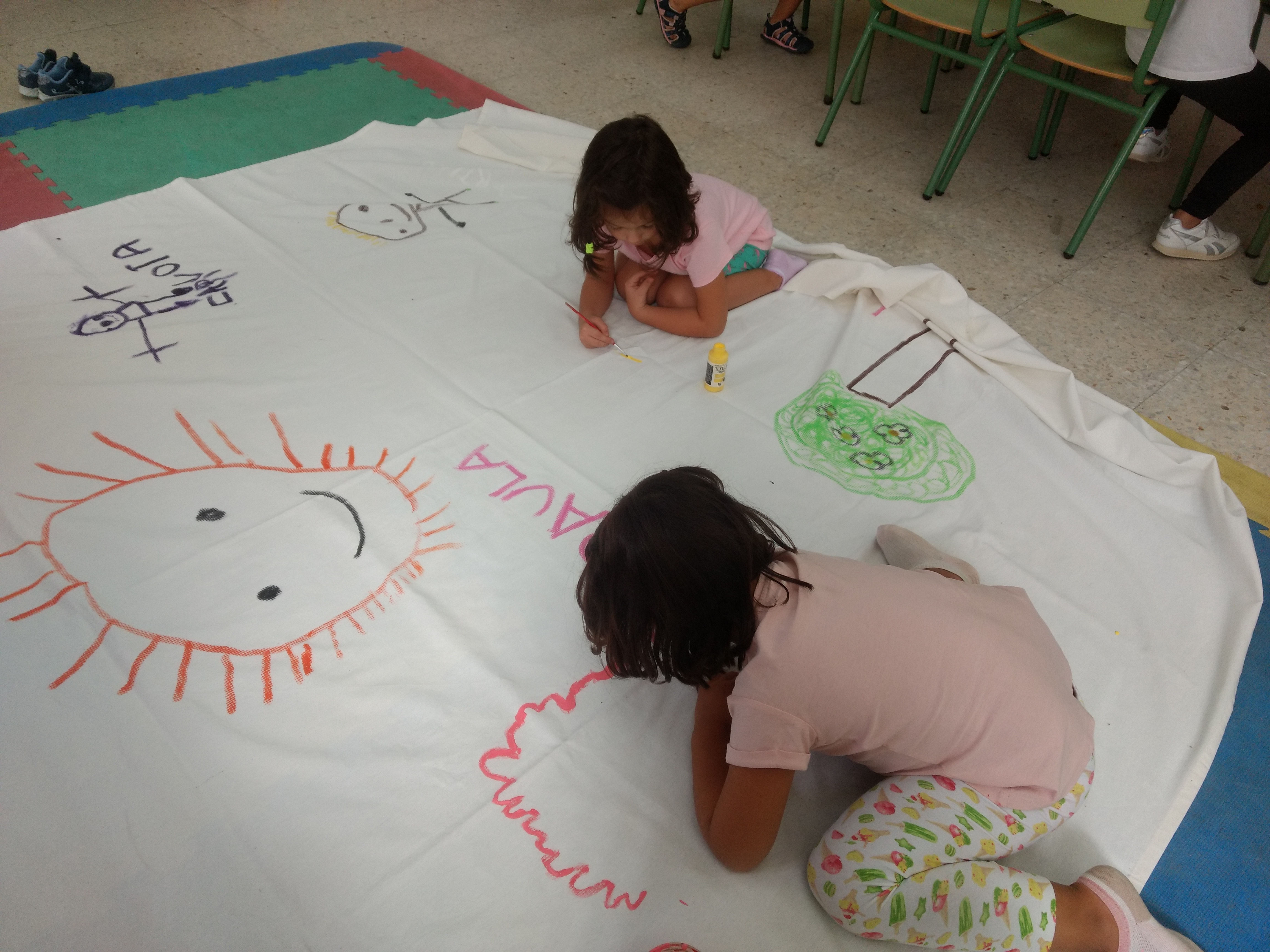 Puesto que han pintado el aula en el verano y hemos descolgado las cortinas, aprovechamos la ocasión para decorarlas. Me gusta que los niños y niñas que están conmigo dejen su impronta. Así siempre los tengo presentes.