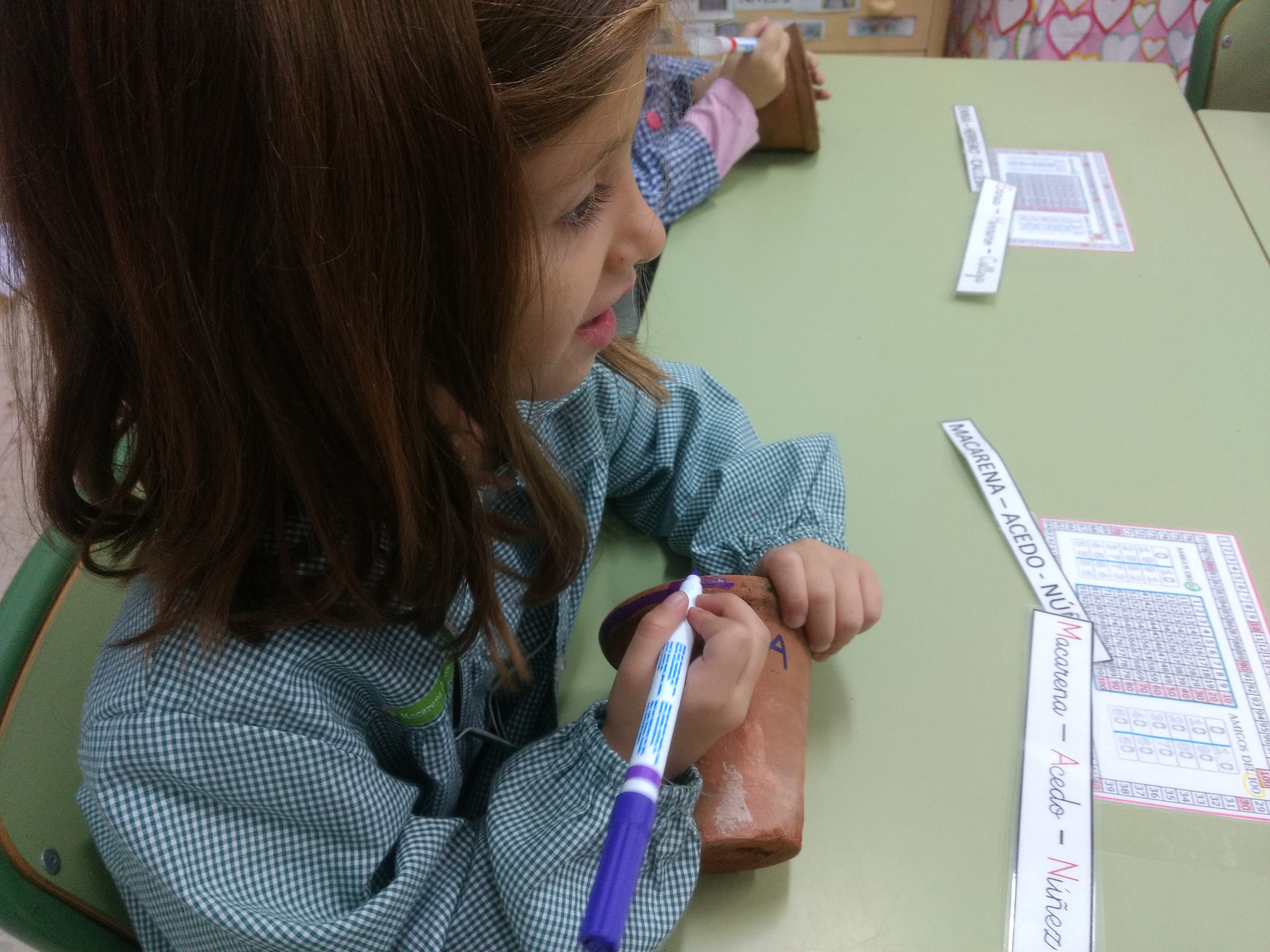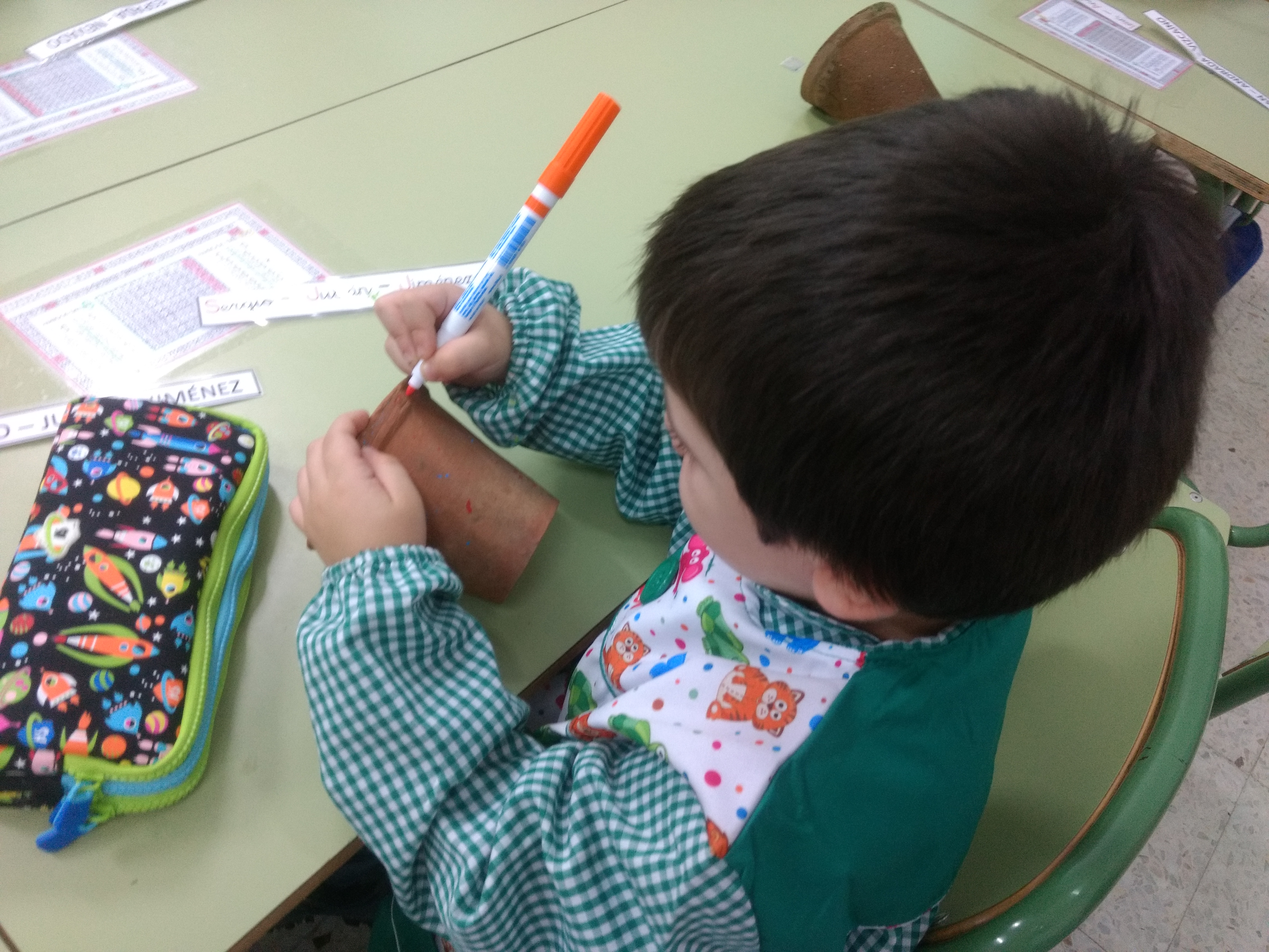 Han decorado un poco cada tiesto y han escrito sus nombres.