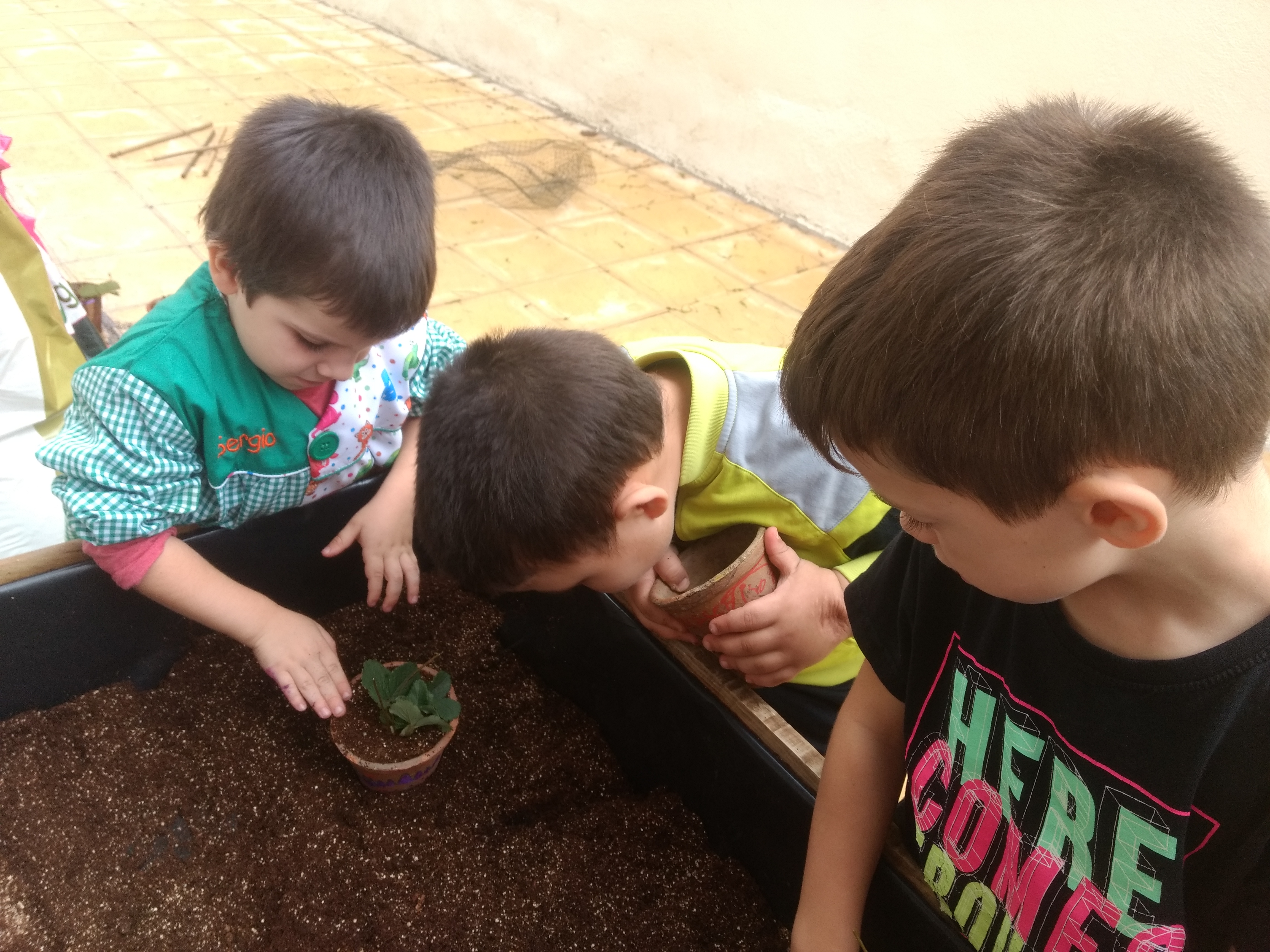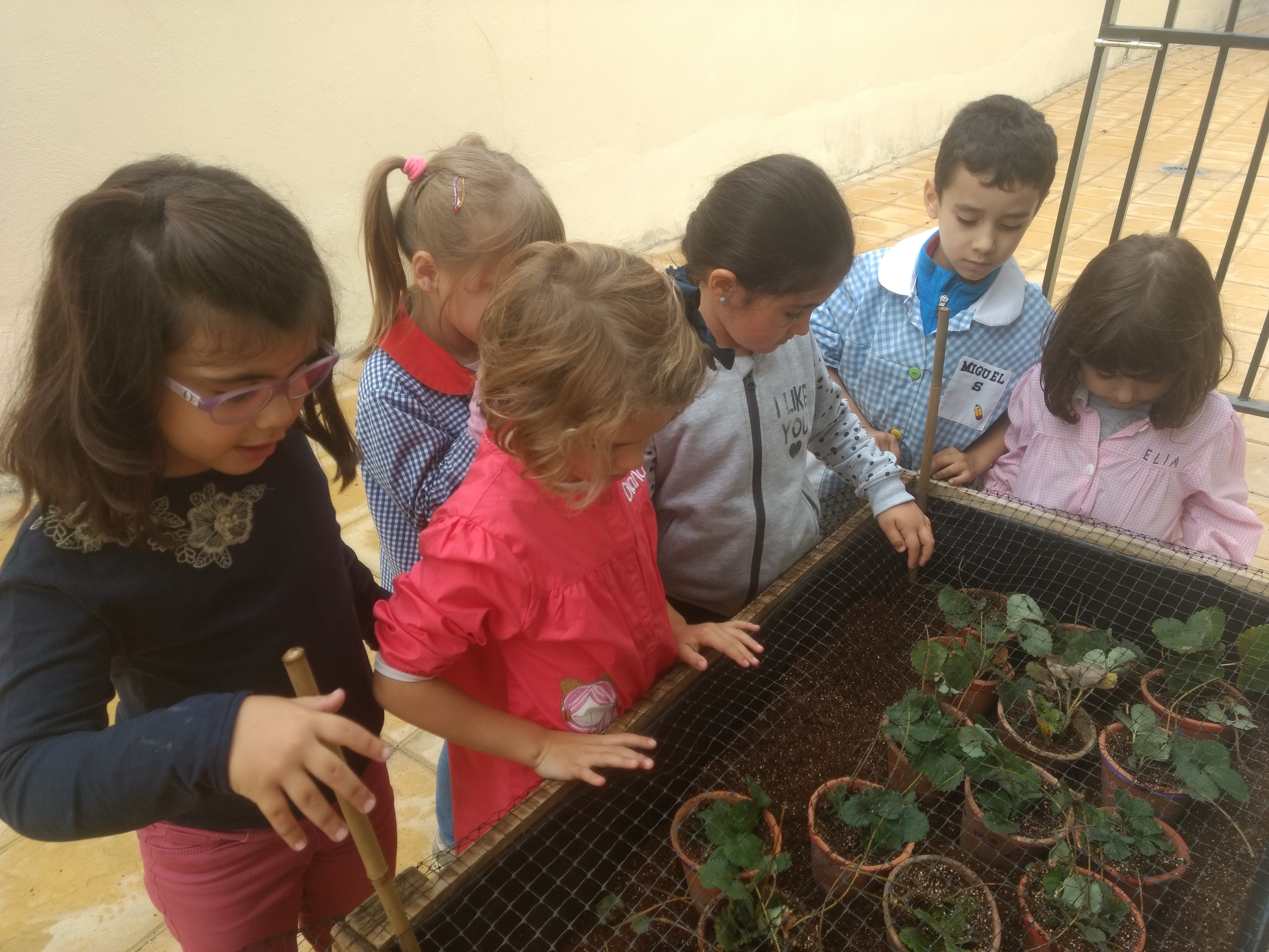 Deseando de comer fresas de nuestro pequeño huerto escolar.