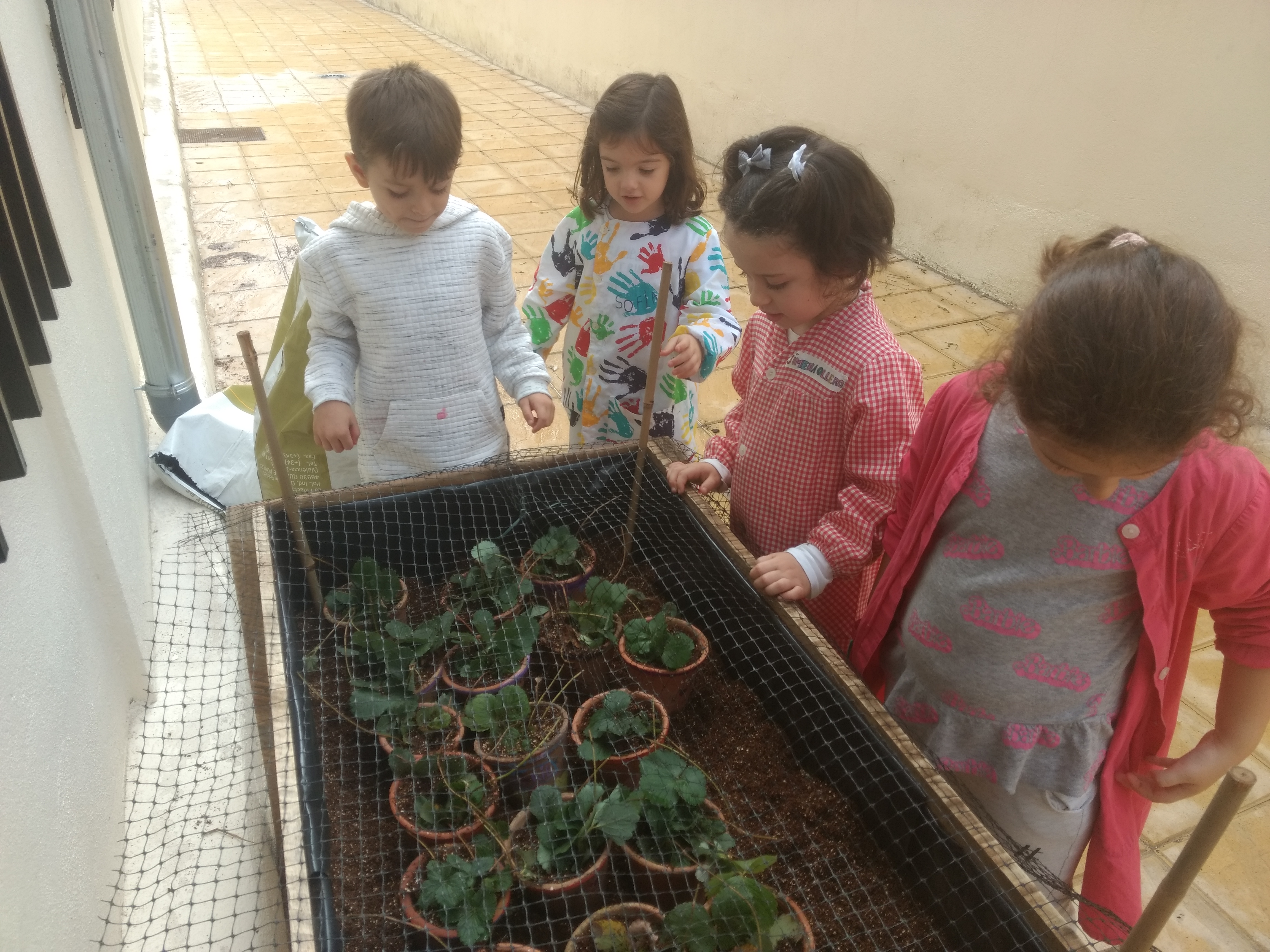Después han sembrado los estolones de fresas y los hemos protegido dentro del banco para que los gatos no las estropeen.