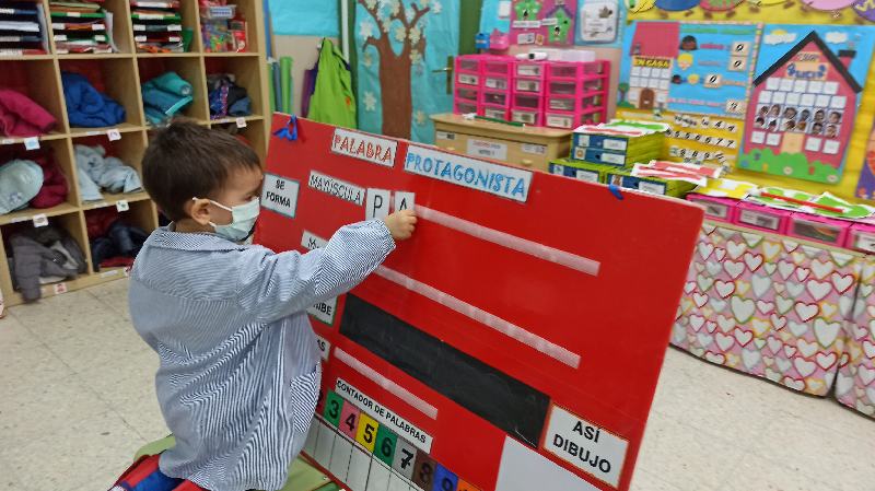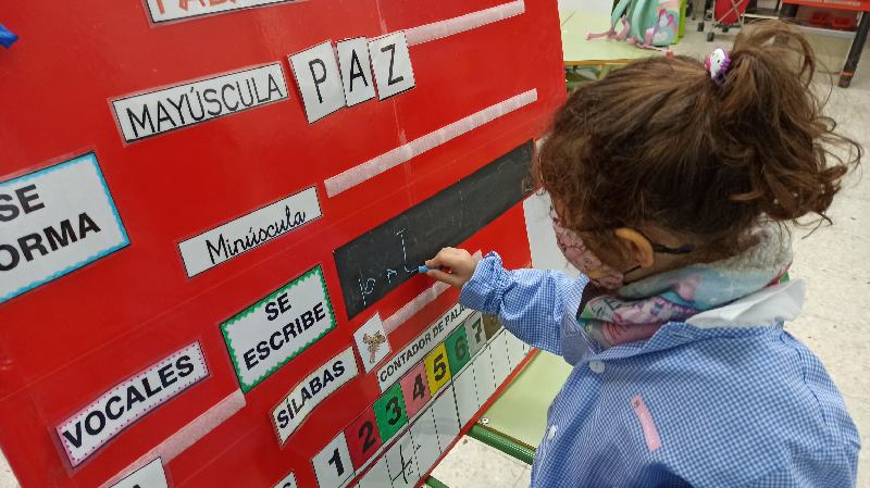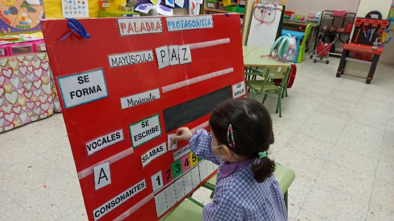 Y hemos utilizado el panel de la palabra protagonista para analizar la palabra Paz: cómo se escribe, cuántas letras tiene, los golpes de voz, incluso a representar la paloma.