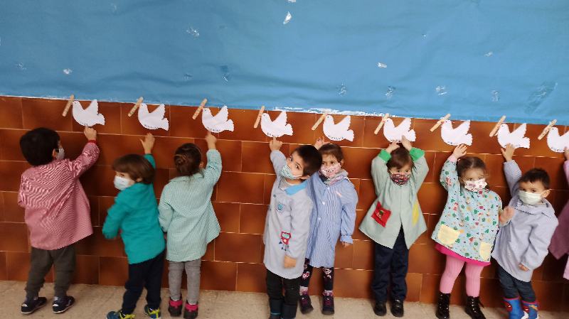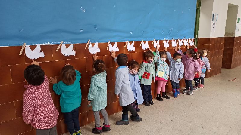 En clase he contado el significado de la palabra Paz, y el símbolo de la paloma. Después cada uno ha picado su paloma y le hemos puesto en el pico una palabra relacionada con la paz: besos, abrazos, amor, amigos, etc.