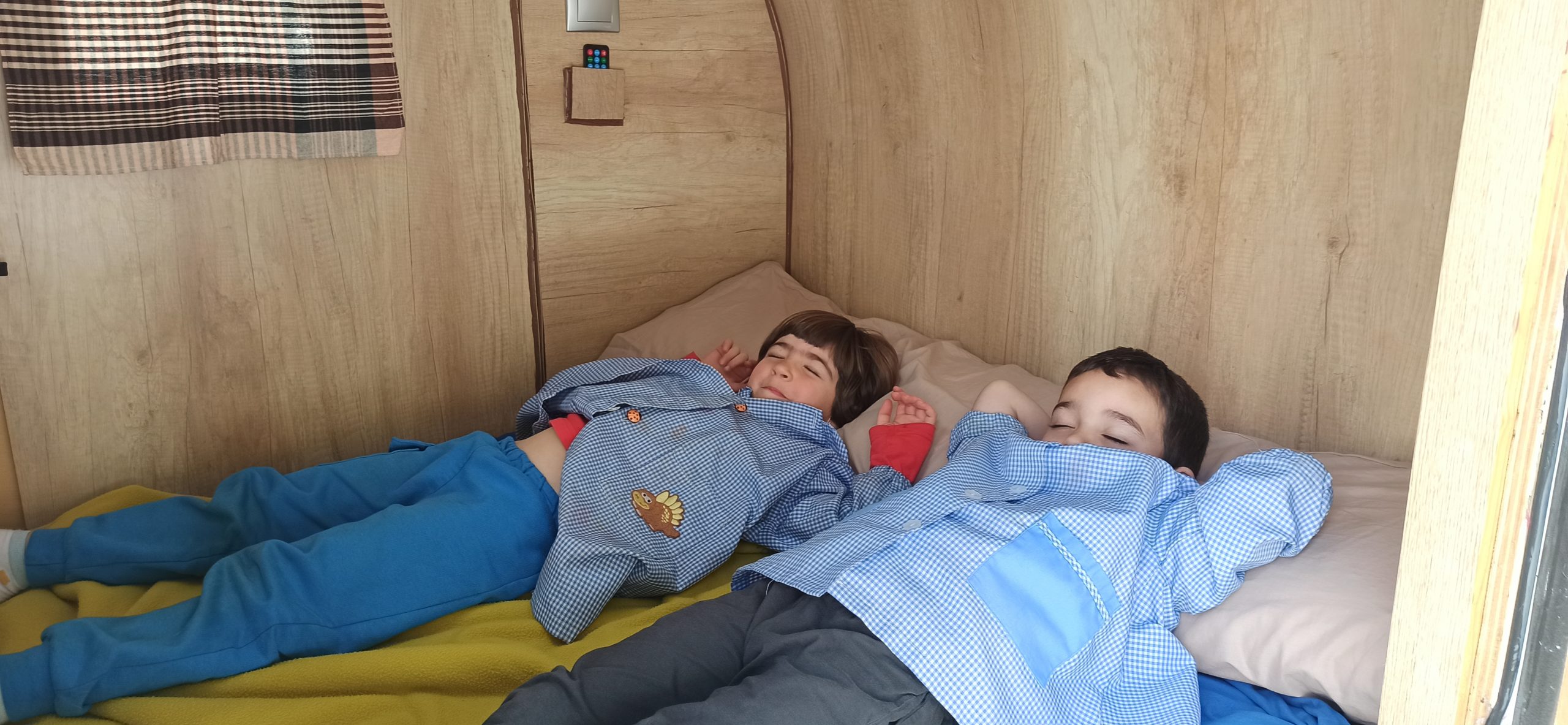 Estela nos trajo una mini caravana con todo lo imprescindible para poder pasar unos días de camping. Les gustó mucho poder tumbarse en la cama y jugar haciendo un picnic. Irene fue una estupenda maestra y repitió a cada pareja todo una y otra vez: desde la ventilación, hasta las luces, je,je.