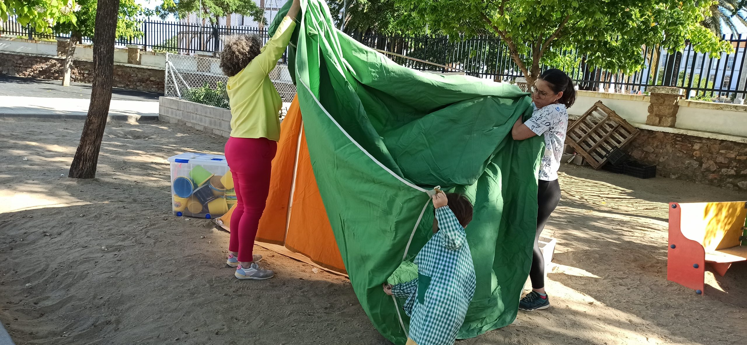 Montar una tienda de campaña no es fácil y menos con un suelo tan duro como el del colegio. Hasta el arenero está durísimo, así que no pudimos  clavar las piquetas, pero el ingenio nos llevó a colocar los bloques que sobraron del huerto en las telas para sujetarlas al suelo.