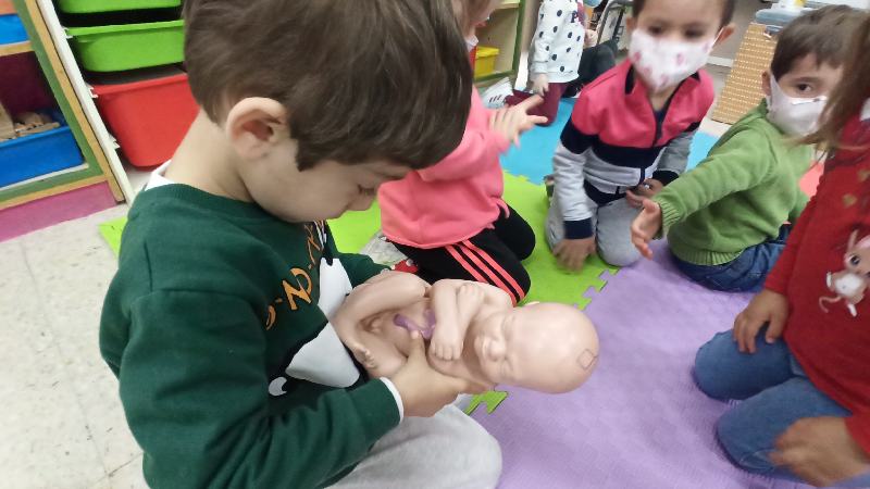 Ha traído una maqueta de un bebé en el interior de una mujer para hacer la explicación más visual. Y les ha gustado mucho coger al bebé.