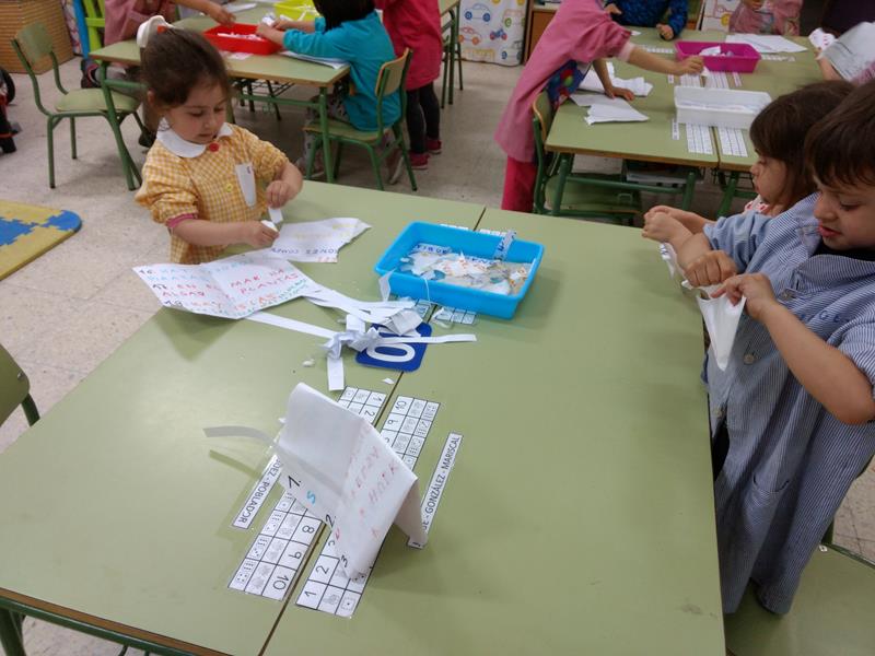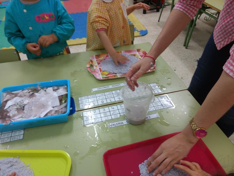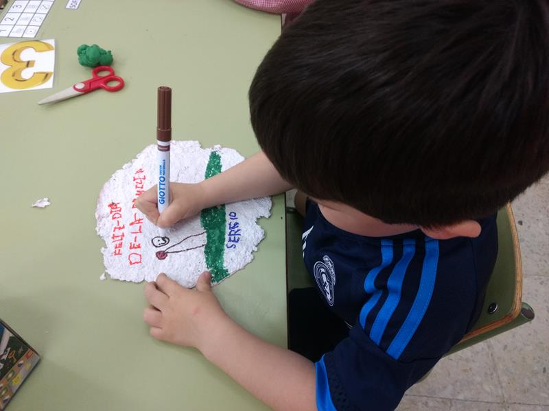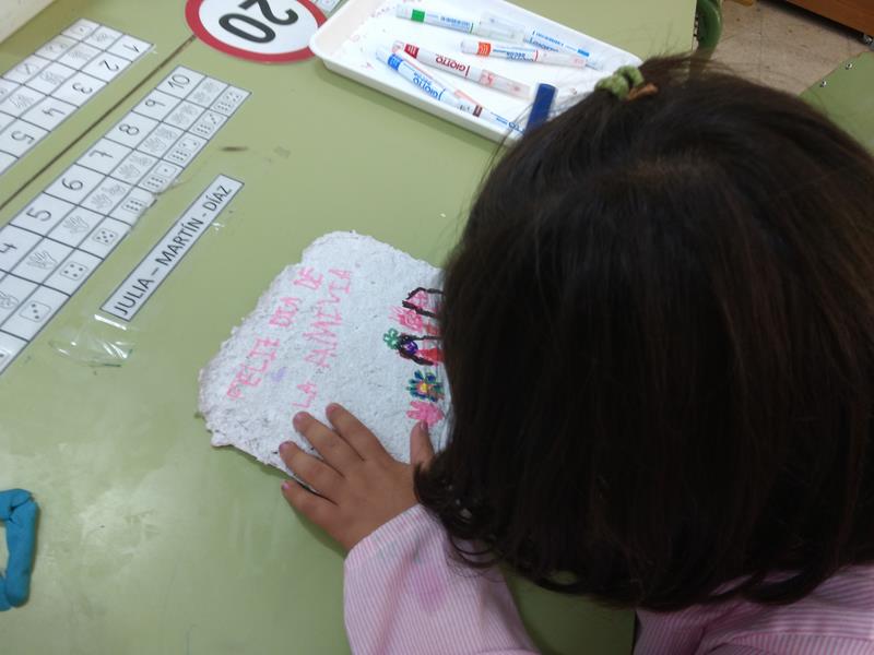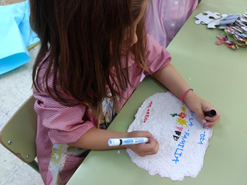 Para ello, la seño Cristina ha pensado en una actividad para el taller de reciclado de material y con pasta de papeles usados, cada uno ha hecho en un papel artesano un hermoso dibujo.