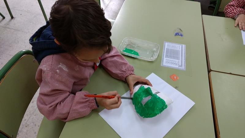 Este trimestre lo estamos dedicando a hacer máscaras de todo tipo: de cartulina, goma Eva, papeles varios y venda de escayola. Las primeras han sido de fácil elaboración y he intentado dejarles que crearan libremente. La que más les ha gustado ha sido Jarramplas.